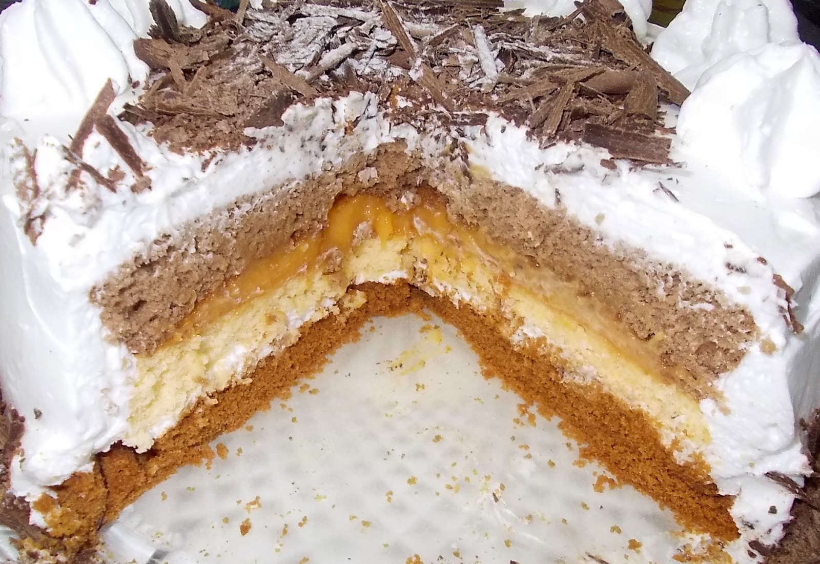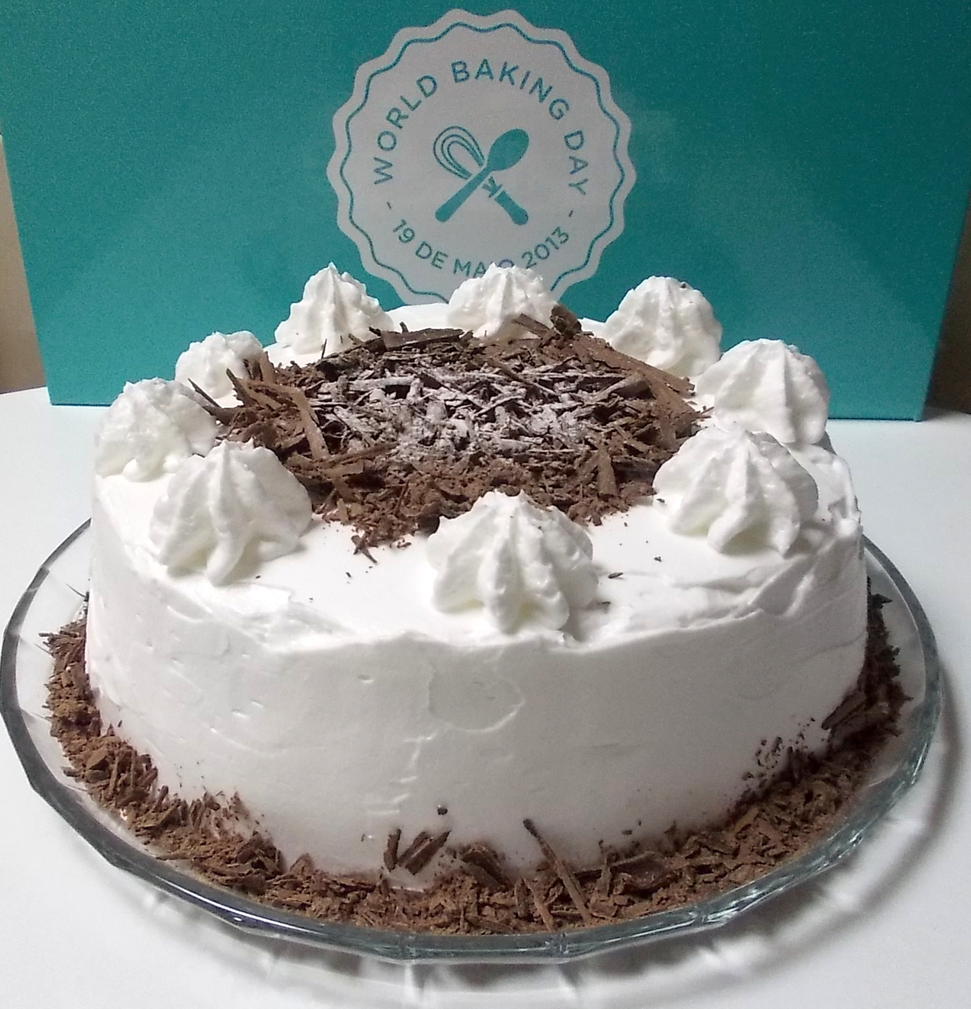Barre todo o bolo com chantilly, decore a gosto com raspas de chocolate.