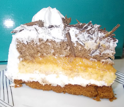Um bolo feito com camadas e recheio diferentes. Uma explosão para o palato. Deu trabalho como podem verificar na descrição mais abaixo, mas fiquei feliz com o resultado, um bolo com o interior bem colorido!