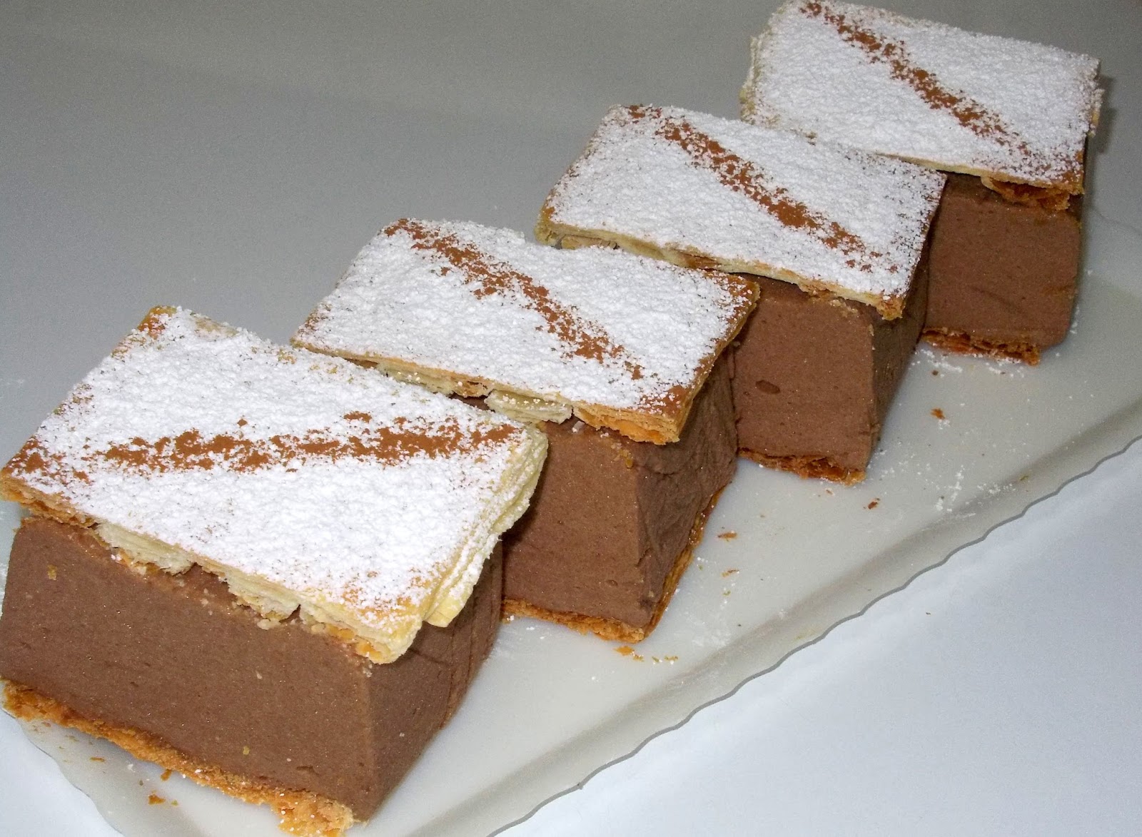 Mil folhas, um pastel que adoro. Já experimentei o tradicional, cuja receita está aqui. E andava com curiosidade para a versão chocolate. Procurei e encontrei no blogue Pratos e Travessas uma versão que me agradou. Alterei, até porque dobrei as quantidades, e devo dizer que ficaram muito bons!
